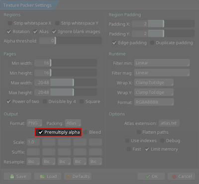 を有効にする。 - 乗算済みアルファ(PMA)(Spineエディター内でのデフォルト設定。ガンマ色空間で事前に乗算されます)