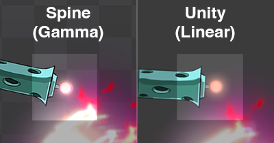 Unityでは、新規プロジェクトにおいてデフォルトでリニア色空間が使用されます。しかしながら、多くのSpineユーザーは、Photoshopなどの外部エディターでレイヤー分けや色補正を施した2Dアセットを扱っています。これらの外部エディターではデフォルトでガンマ空間でのブレンド処理が行われます。その結果、Unityでブレンドされた色は、元のアートワークと比較してくすみや彩度の低下が見られ、不満を感じる場合があるでしょう。